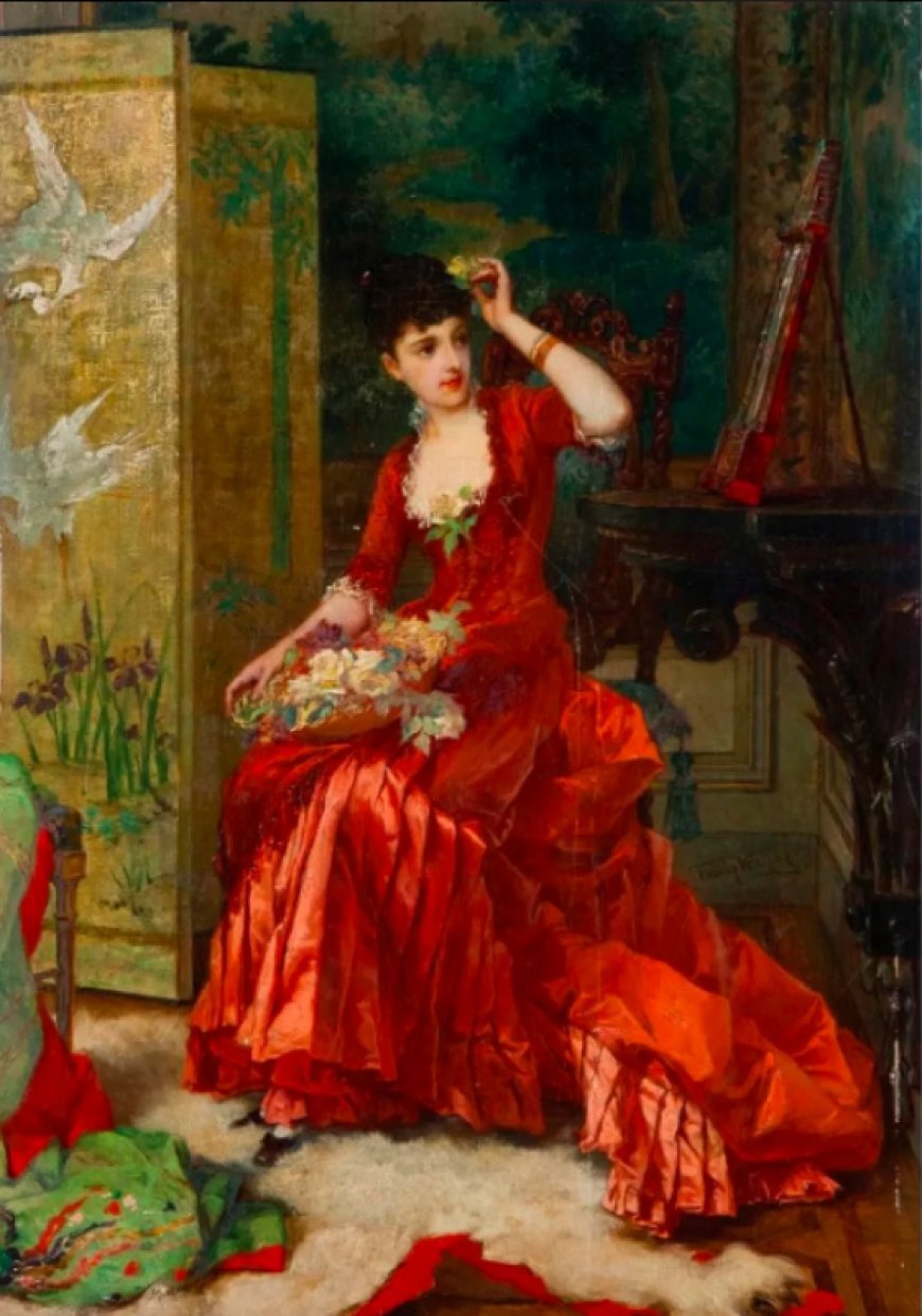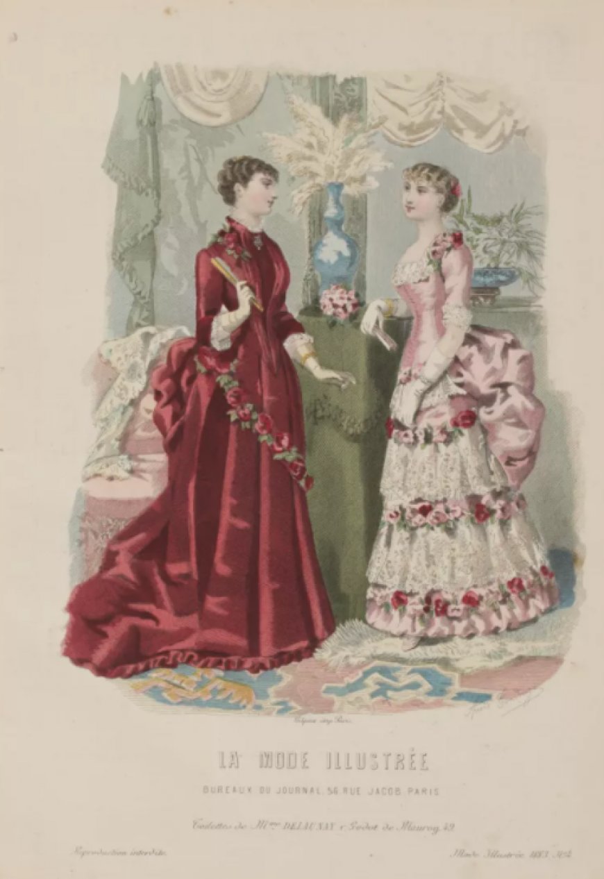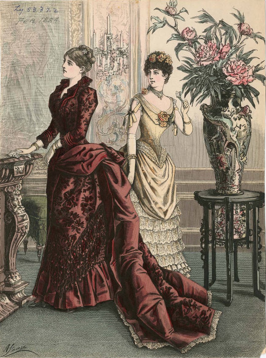 Красный цвет платья был популярен для вечерних нарядов: октябрьский выпуск «Харперс Базар» 1884 года упоминает «ярко-маковый красный» и «тёмный красный георгина». Апронообразная оверскирт — частый элемент, как пишет ноябрьский выпуск «Харперс Базар» 1883 года: «очень длинная апрон-оверскирт с кластером складок, драпированных высоко и далеко назад по бокам».